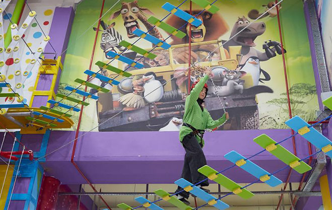Высоченный двухуровневый верёвочный городок, просторная батутная зона, надувная подушка, тарзанки, скалодромы, лестница в небеса ждут самых смелых и активных гостей нашего парка.